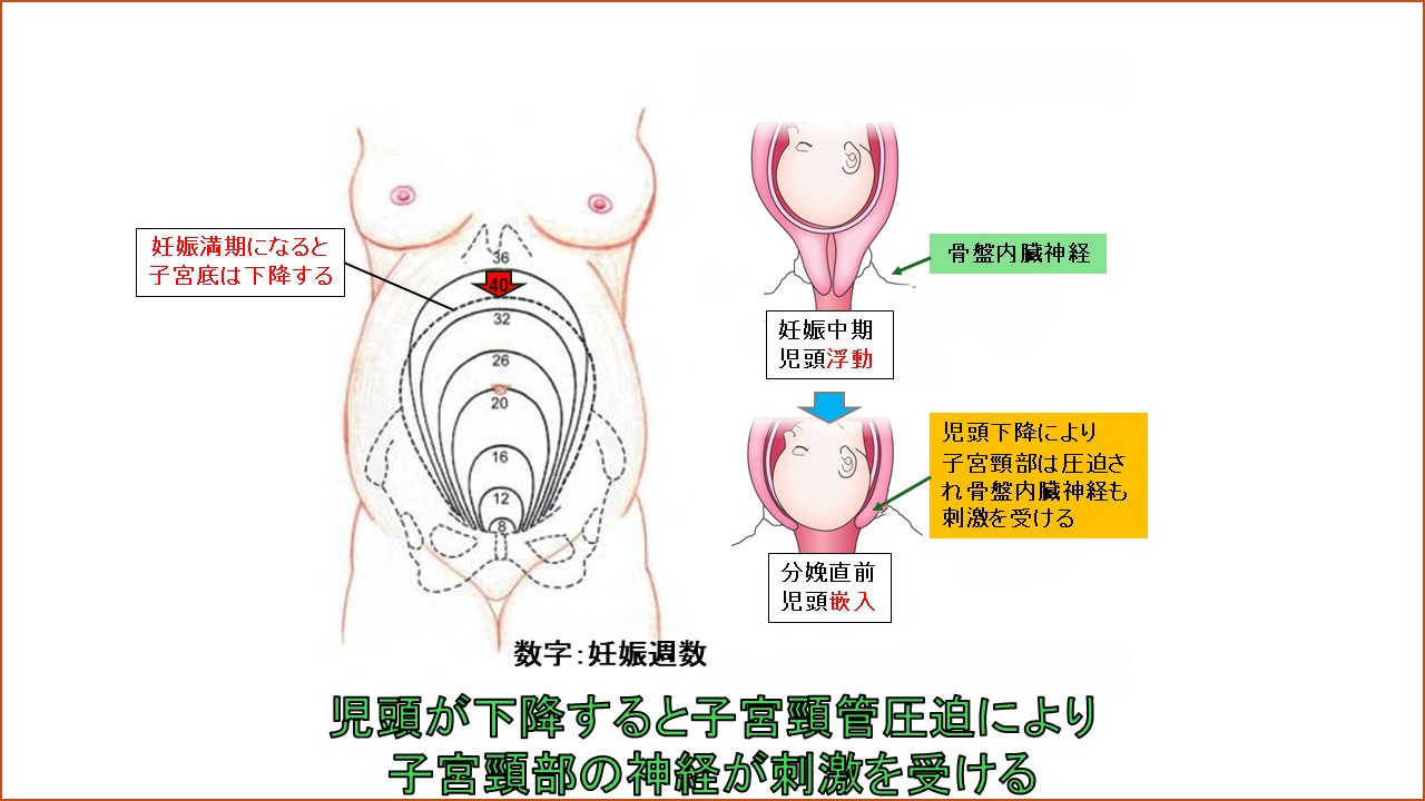 妊娠満期に入ると、児頭の骨盤内下降とともに子宮底も同じように下降していきます。妊娠中期には児頭は骨盤内にまだ下降しておらず浮動した状態となっており、子宮頸部に接続する骨盤内臓神経も刺激は受けていません。児頭の骨盤内進入は分娩直前には児頭の嵌入した状態となり、その児頭の下降により、子宮頸部が圧迫され、骨盤内臓神経も刺激を受けることになります。