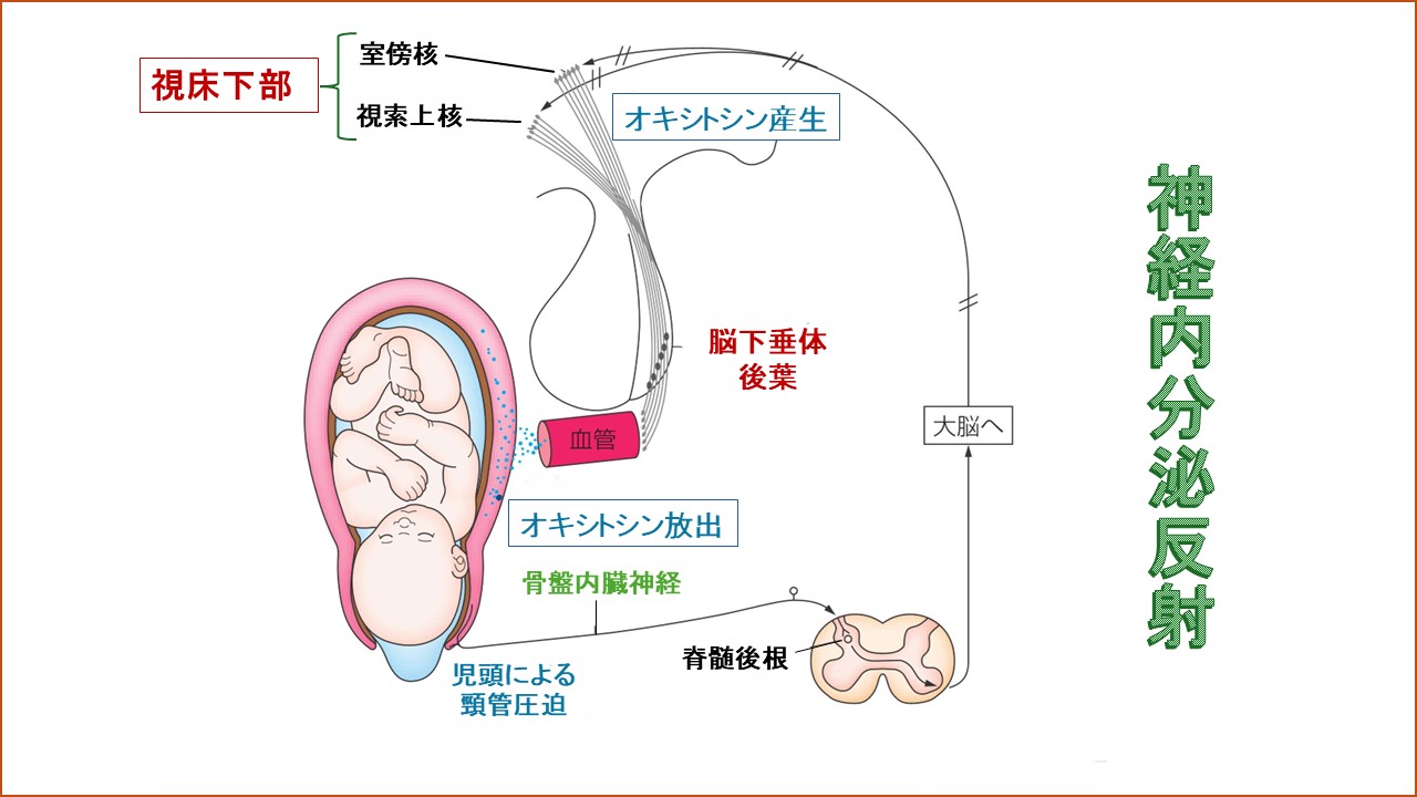 これら一連の児頭の下降による神経を介したオキシトシン産生のメカニズムが、神経内分泌反射と呼ばれています。